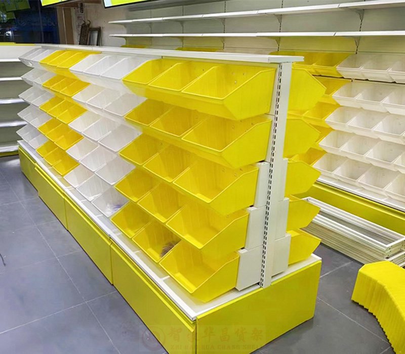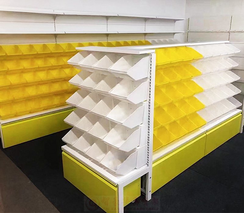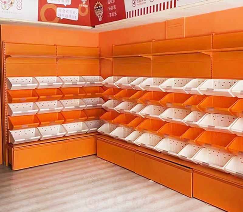 【特 點】整體結構采用冷軋鋼材制作,搭配塑料食品盒子,零食貨架頂部可以搭配廣告文字及射燈,突出商品展示效果。多層分格、使商品整理有序干凈美觀。底部儲物柜設計,造型樸實大方實用性強。