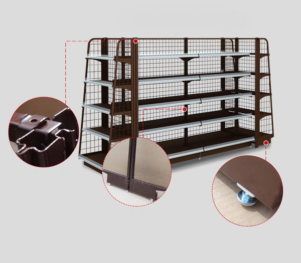 3.貨架穩定性強,貨架頂部上連桿、小卡扣固定實背板更穩固;下面的調節螺絲,可使貨架擺放在不平坦的地面。